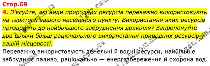 4. З’ясуйте, які види природних ресурсів переважно використовують на території вашого населеного пункту. Використання яких ресурсів призводить до найбільшого забруднення довкілля? Запропонуйте два шляхи більш раціонального використання природних ресурсів у вашій місцевості. Переважно використовують земельні й водні ресурси, найбільше забруднює паливо, раціонально — енергозбереження й охорона вод.