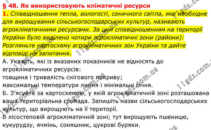 § 48. Як використовують кліматичні ресурси 1. Співвідношення тепла, вологості, сонячного світла, яке необхідне для вирощування сільськогосподарських культур, називають агрокліматичними ресурсами. За цим співвідношенням на території України було виділено чотири агрокліматичні зони (райони): Розгляньте картосхему агрокліматичних зон України та дайте відповіді на запитання. А. Укажіть, які із вказаних показників не відносять до агрокліматичних ресурсів: товщина і тривалість снігового покриву; максимальні температури липня і мінімальні січня. Б. З’ясуйте за картосхемою, у якій агрокліматичній зоні розташована ваша територіальна громада. Запишіть назви сільськогосподарських культур, що вирощують на її території. В лісостеповій агрокліматичній зоні; тут вирощують пшеницю, кукурудзу, ячмінь, соняшник, цукрові буряки.