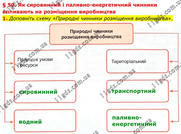§ 50. Як сировинний і паливно-енергетичний чинники впливають на розміщення виробництва 1. Доповніть схему «Природні чинники розміщення виробництва».