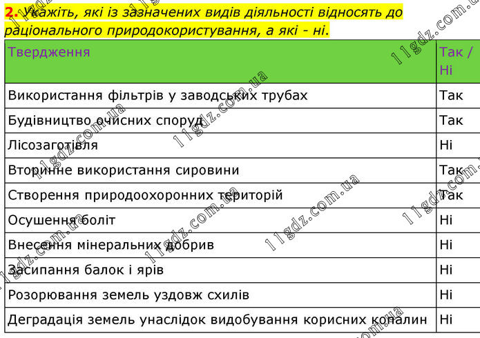 2. Укажіть, які із зазначених видів діяльності відносять до раціонального природокористування, а які - ні. Твердження Так / Ні Використання фільтрів у заводських трубах Так Будівництво очисних споруд Так Лісозаготівля Ні Вторинне використання сировини Так Створення природоохоронних територій Так Осушення боліт Ні Внесення мінеральних добрив Ні Засипання балок і ярів Ні Розорювання земель уздовж схилів Ні Деградація земель унаслідок видобування корисних копалин Ні