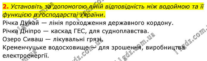 2. Установіть за допомогою ліній відповідність між водоймою та її функцією в господарстві України. Річка Дунай — лінія проходження державного кордону. Річка Дніпро — каскад ГЕС, для судноплавства. Озеро Сиваш — лікувальні грязі. Кременчуцьке водосховище — для зрошення, виробництва електроенергії.