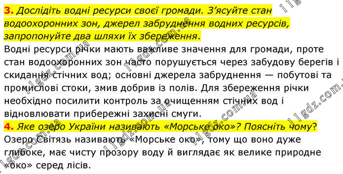 3. Дослідіть водні ресурси своєї громади. З’ясуйте стан водоохоронних зон, джерел забруднення водних ресурсів, запропонуйте два шляхи їх збереження. Водні ресурси річки мають важливе значення для громади, проте стан водоохоронних зон часто порушується через забудову берегів і скидання стічних вод; основні джерела забруднення — побутові та промислові стоки, змив добрив із полів. Для збереження річки необхідно посилити контроль за очищенням стічних вод і відновлювати прибережні захисні смуги. 4. Яке озеро України називають «Морське око»? Поясніть чому? Озеро Світязь називають «Морське око», тому що воно дуже глибоке, має чисту прозору воду й виглядає як велике природне «око» серед лісів.