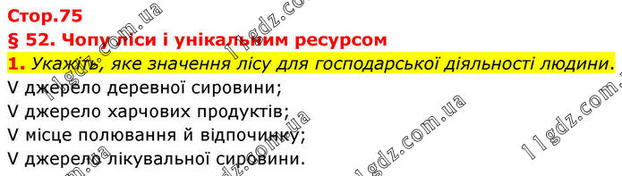 § 52. Чопу ліси і унікальним ресурсом 1. Укажіть, яке значення лісу для господарської діяльності людини. V джерело деревної сировини; V джерело харчових продуктів; V місце полювання й відпочинку; V джерело лікувальної сировини.