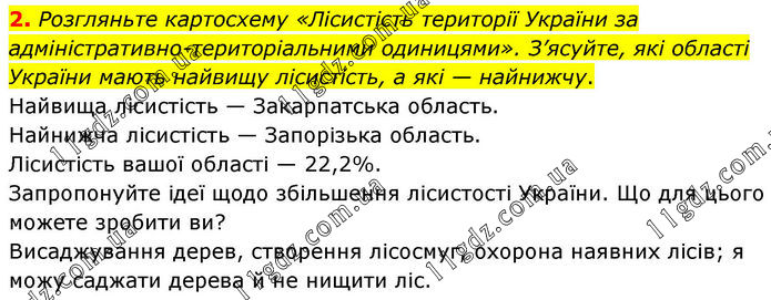 2. Розгляньте картосхему «Лісистість території України за адміністративно-територіальними одиницями». З’ясуйте, які області України мають найвищу лісистість, а які — найнижчу. Найвища лісистість — Закарпатська область. Найнижча лісистість — Запорізька область. Лісистість вашої області — 22,2%. Запропонуйте ідеї щодо збільшення лісистості України. Що для цього можете зробити ви? Висаджування дерев, створення лісосмуг, охорона наявних лісів; я можу саджати дерева й не нищити ліс.