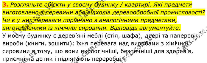 3. Розгляньте об’єкти у своєму будинку / квартирі. Які предмети виготовлено з деревини або відходів деревообробної промисловості? Чи є у них переваги порівняно з аналогічними предметами, виготовленими із хімічної сировини. Відповідь аргументуйте. У моєму будинку є дерев’яні меблі (стіл, шафа), двері та паперові вироби (книги, зошити); їхня перевага над виробами з хімічної сировини в тому, що вони екологічніші, безпечніші для здоров’я, приємні на дотик і підлягають переробці.