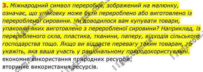 3. Міжнародний символ переробки, зображений на малюнку, означає, що упаковку може бути перероблено або виготовлено із переробленої сировини. Чи доводилося вам купувати товари, упаковки яких виготовлено з переробленої сировини? Наприклад, із переробленого скла, пластика, тканини, паперу, відходів сільського господарства тощо. Якщо ви віддаєте перевагу таким товарам, то укажіть, яка ваша участь у раціональному природокористуванні. економне використання природних ресурсів; вторинне використання ресурсів.