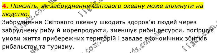 4. Поясніть, як забруднення Світового океану може вплинути на людство. Забруднення Світового океану шкодить здоров’ю людей через забруднену рибу й морепродукти, зменшує рибні ресурси, погіршує умови життя прибережних територій і завдає економічних збитків рибальству та туризму.