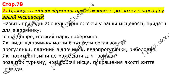 2. Проведіть мінідослідження про можливості розвитку рекреації у вашій місцевості: Назвіть природні або культурні об’єкти у вашій місцевості, придатні для відпочинку. річка Дніпро, міський парк, набережна. Які види відпочинку могли б тут бути організовані. прогулянки, пляжний відпочинок, велопрогулянки, риболовля. Які позитивні зміни це може дати для громади? розвиток туризму, нові робочі місця, покращення якості життя громади.