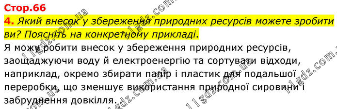 4. Який внесок у збереження природних ресурсів можете зробити ви? Поясніть на конкретному прикладі. Я можу робити внесок у збереження природних ресурсів, заощаджуючи воду й електроенергію та сортувати відходи, наприклад, окремо збирати папір і пластик для подальшої переробки, що зменшує використання природної сировини і забруднення довкілля.