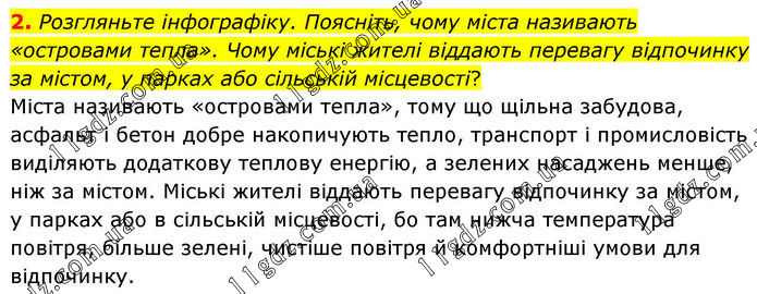 2. Розгляньте інфографіку. Поясніть, чому міста називають «островами тепла». Чому міські жителі віддають перевагу відпочинку за містом, у парках або сільській місцевості? Міста називають «островами тепла», тому що щільна забудова, асфальт і бетон добре накопичують тепло, транспорт і промисловість виділяють додаткову теплову енергію, а зелених насаджень менше, ніж за містом. Міські жителі віддають перевагу відпочинку за містом, у парках або в сільській місцевості, бо там нижча температура повітря, більше зелені, чистіше повітря й комфортніші умови для відпочинку.