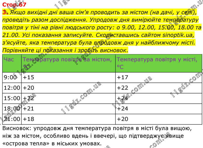 3. Якщо вихідні дні ваша сім’я проводить за містом (на дачі, у селі), проведіть разом дослідження. Упродовж дня вимірюйте температуру повітря у тіні на рівні людського росту: о 9.00, 12.00, 15.00, 18.00 та 21.00. Усі показання записуйте. Скориставшись сайтом sinoptik.ua, з’ясуйте, яка температура була впродовж дня у найближчому місті. Порівняйте ці показання і зробіть висновок. Час Температура повітря за містом, °C Температура повітря у місті, °C 9:00 +15 +17 12:00 +20 +22 15:00 +22 +24 18:00 +21 +24 21:00 +18 +20 Висновок: упродовж дня температура повітря в місті була вищою, ніж за містом, особливо вдень і ввечері, що підтверджує явище «острова тепла» в міських умовах.