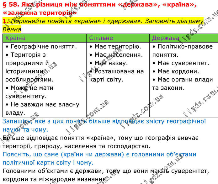 § 58. Яка різниця між поняттями «держава», «країна», «залежна територія» 1. Порівняйте поняття «країна» і «держава». Заповніть діаграму Венна Країна Спільне Держава • Географічне поняття. • Територія з природними й історичними особливостями. • Може не мати суверенітету. • Не завжди має власну владу. • Має територію. • Має населення. • Має назву. • Розташована на карті світу. • Політико-правове поняття. • Має суверенітет. • Має кордони. • Має органи влади та закони. Запишіть, яке з цих понять більше відповідає змісту географічної науки та чому. Більше відповідає поняття «країна», тому що географія вивчає території, природу, населення та господарство. Поясніть, що саме (країни чи держави) є головними об’єктами політичної карти світу і чому. Головними об’єктами є держави, тому що вони мають суверенітет, кордони та міжнародне визнання.