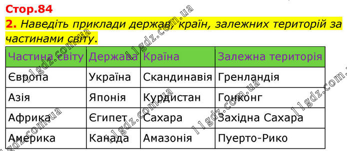 2. Наведіть приклади держав, країн, залежних територій за частинами світу. Частина світу Держава Країна Залежна територія Європа Україна Скандинавія Гренландія Азія Японія Курдистан Гонконг Африка Єгипет Сахара Західна Сахара Америка Канада Амазонія Пуерто-Рико
