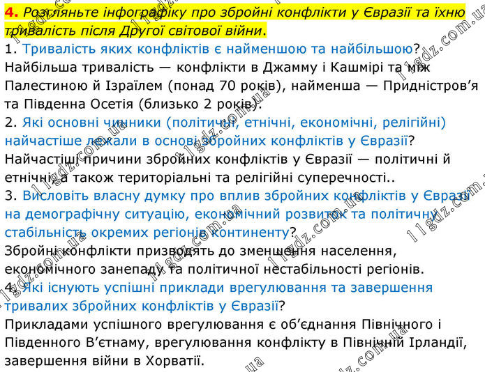 4. Розгляньте інфографіку про збройні конфлікти у Євразії та їхню тривалість після Другої світової війни. 1. Тривалість яких конфліктів є найменшою та найбільшою? Найбільша тривалість — конфлікти в Джамму і Кашмірі та між Палестиною й Ізраїлем (понад 70 років), найменша — Придністров’я та Південна Осетія (близько 2 років). 2. Які основні чинники (політичні, етнічні, економічні, релігійні) найчастіше лежали в основі збройних конфліктів у Євразії? Найчастіші причини збройних конфліктів у Євразії — політичні й етнічні, а також територіальні та релігійні суперечності.. 3. Висловіть власну думку про вплив збройних конфліктів у Євразії на демографічну ситуацію, економічний розвиток та політичну стабільність окремих регіонів континенту? Збройні конфлікти призводять до зменшення населення, економічного занепаду та політичної нестабільності регіонів. 4. Які існують успішні приклади врегулювання та завершення тривалих збройних конфліктів у Євразії? Прикладами успішного врегулювання є об’єднання Північного і Південного В’єтнаму, врегулювання конфлікту в Північній Ірландії, завершення війни в Хорватії.