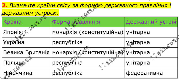 2. Визначте країни світу за формою державного правління і державним устроєм. Країна Форма правління Державний устрій Японія монархія (конституційна) унітарна Україна республіка унітарна Велика Британія монархія (конституційна) унітарна Польща республіка унітарна Німеччина республіка федеративна