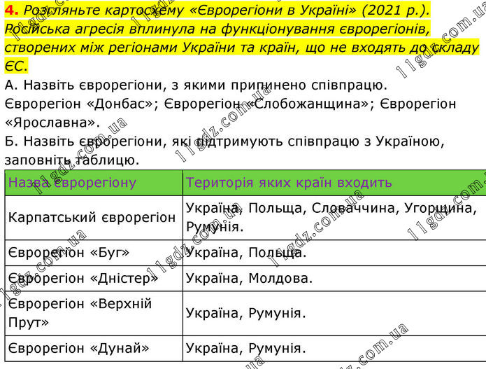 4. Розгляньте картосхему «Єврорегіони в Україні» (2021 p.). Російська агресія вплинула на функціонування єврорегіонів, створених між регіонами України та країн, що не входять до складу ЄС. А. Назвіть єврорегіони, з якими припинено співпрацю. Єврорегіон «Донбас»; Єврорегіон «Слобожанщина»; Єврорегіон «Ярославна». Б. Назвіть єврорегіони, які підтримують співпрацю з Україною, заповніть таблицю. Назва єврорегіону Територія яких країн входить Карпатський єврорегіон Україна, Польща, Словаччина, Угорщина, Румунія. Єврорегіон «Буг» Україна, Польща. Єврорегіон «Дністер» Україна, Молдова. Єврорегіон «Верхній Прут» Україна, Румунія. Єврорегіон «Дунай» Україна, Румунія.