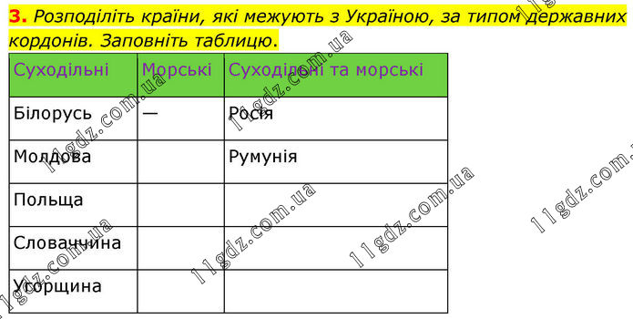 3. Розподіліть країни, які межують з Україною, за типом державних кордонів. Заповніть таблицю. Суходільні Морські Суходільні та морські Білорусь — Росія Молдова Румунія Польща Словаччина Угорщина