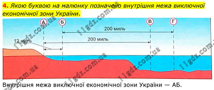 4. Якою буквою на малюнку позначено внутрішня межа виключної економічної зони України. Внутрішня межа виключної економічної зони України — АБ.