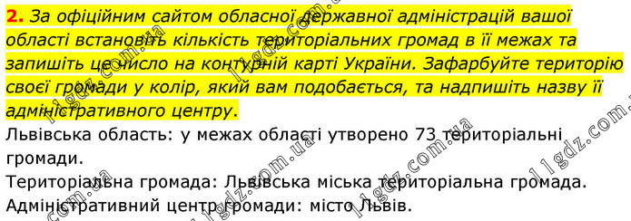 2. За офіційним сайтом обласної державної адміністрацій вашої області встановіть кількість територіальних громад в її межах та запишіть це число на контурній карті України. Зафарбуйте територію своєї громади у колір, який вам подобається, та надпишіть назву її адміністративного центру. Львівська область: у межах області утворено 73 територіальні громади. Територіальна громада: Львівська міська територіальна громада. Адміністративний центр громади: місто Львів.