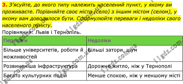 3. З’ясуйте, до якого типу належить населений пункт, у якому ви проживаєте. Порівняйте своє місто (село) з іншим містом (селом), у якому вам доводилося бути. Сформулюйте переваги і недоліки свого населеного пункту. Порівняння: Львів і Тернопіль. Переваги Недоліки Більше університетів, роботи й можливостей Більші затори, шум Розвиненіша інфраструктура Дорожче житло, ніж у Тернополі Багато культурних подій Менше спокою, ніж у меншому місті