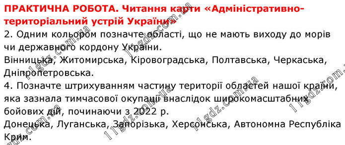 ПРАКТИЧНА РОБОТА. Читання карти «Адміністративно-територіальний устрій України» 2. Одним кольором позначте області, що не мають виходу до морів чи державного кордону України. Вінницька, Житомирська, Кіровоградська, Полтавська, Черкаська, Дніпропетровська. 4. Позначте штрихуванням частину території областей нашої країни, яка зазнала тимчасової окупації внаслідок широкомасштабних бойових дій, починаючи з 2022 р. Донецька, Луганська, Запорізька, Херсонська, Автономна Республіка Крим.