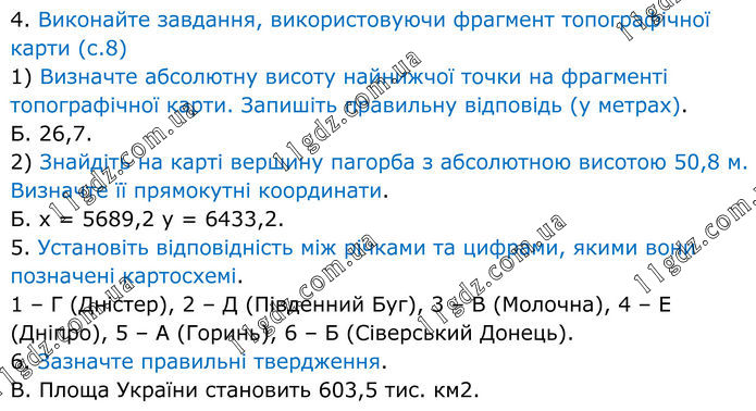 4. Виконайте завдання, використовуючи фрагмент топографічної карти (с.8) 1) Визначте абсолютну висоту найнижчої точки на фрагменті топографічної карти. Запишіть правильну відповідь (у метрах). Б. 26,7. 2) Знайдіть на карті вершину пагорба з абсолютною висотою 50,8 м. Визначте її прямокутні координати. Б. x = 5689,2 у = 6433,2. 5. Установіть відповідність між річками та цифрами, якими вони позначені картосхемі. 1 – Г (Дністер), 2 – Д (Південний Буг), 3 – В (Молочна), 4 – Е (Дніпро), 5 – А (Горинь), 6 – Б (Сіверський Донець). 6. Зазначте правильні твердження. В. Площа України становить 603,5 тис. км2.
