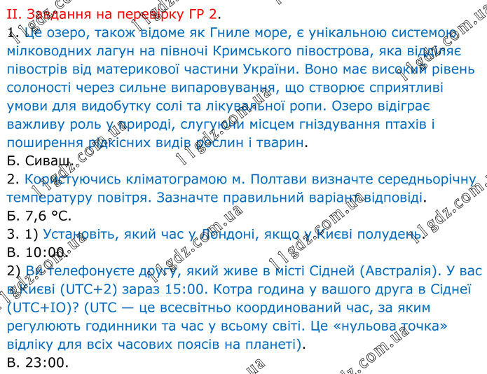 II. Завдання на перевірку ГР 2. 1. Це озеро, також відоме як Гниле море, є унікальною системою мілководних лагун на півночі Кримського півострова, яка відділяє півострів від материкової частини України. Воно має високий рівень солоності через сильне випаровування, що створює сприятливі умови для видобутку солі та лікувальної ропи. Озеро відіграє важливу роль у природі, слугуючи місцем гніздування птахів і поширення рідкісних видів рослин і тварин. Б. Сиваш. 2. Користуючись кліматограмою м. Полтави визначте середньорічну температуру повітря. Зазначте правильний варіант відповіді. Б. 7,6 °С. 3. 1) Установіть, який час у Лондоні, якщо у Києві полудень. В. 10:00. 2) Ви телефонуєте другу, який живе в місті Сідней (Австралія). У вас в Києві (UTC+2) зараз 15:00. Котра година у вашого друга в Сіднеї (UTC+ІО)? (UTC — це всесвітньо координований час, за яким регулюють годинники та час у всьому світі. Це «нульова точка» відліку для всіх часових поясів на планеті). В. 23:00.