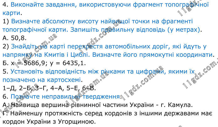 4. Виконайте завдання, використовуючи фрагмент топографічної карти. 1) Визначте абсолютну висоту найвищої точки на фрагменті топографічної карти. Запишіть правильну відповідь (у метрах). А. 50,8. 2) Знайдіть на карті перехрестя автомобільних доріг, які йдуть у напрямку на Кмитів і Циблі. Визначте його прямокутні координати. Б. х = 5686,9; у = 6435,1. 5. Установіть відповідність між річками та цифрами, якими їх позначено на картосхемі. 1–Д, 2–Б, 3–Г, 4–А, 5–Е, 6–В. 6. Позначте неправильні твердження. А. Найвища вершина рівнинної частини України - г. Камула. Г. Найменшу протяжність серед кордонів з іншими державами має кордон України з Угорщиною.
