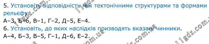 5. Установіть відповідність між тектонічними структурами та формами рельєфу. А–3, Б–6, В–1, Г–2, Д–5, Е–4. 6. Установіть, до яких наслідків призводять вказані чинники. А–4, Б–3, В–5, Г–1, Д–6, Е–2.