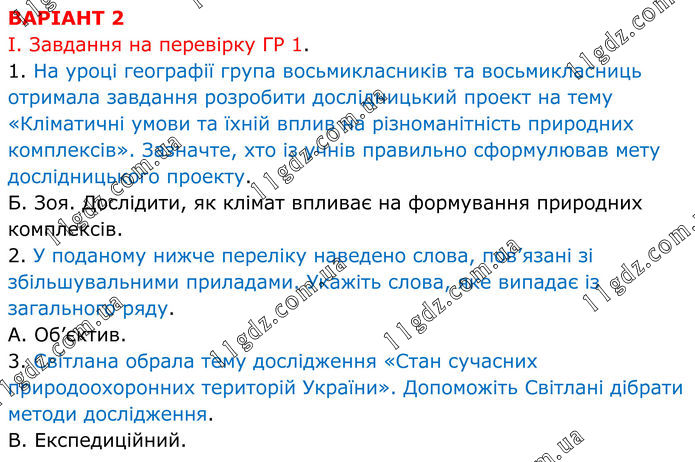 ВАРІАНТ 2 І. Завдання на перевірку ГР 1. 1. На уроці географії група восьмикласників та восьмикласниць отримала завдання розробити дослідницький проект на тему «Кліматичні умови та їхній вплив на різноманітність природних комплексів». Зазначте, хто із учнів правильно сформулював мету дослідницького проекту. Б. Зоя. Дослідити, як клімат впливає на формування природних комплексів. 2. У поданому нижче переліку наведено слова, пов’язані зі збільшувальними приладами. Укажіть слова, яке випадає із загального ряду. А. Об’єктив. 3. Світлана обрала тему дослідження «Стан сучасних природоохоронних територій України». Допоможіть Світлані дібрати методи дослідження. В. Експедиційний.