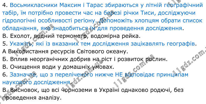 4. Восьмикласники Максим і Тарас збираються у літній географічний табір, їм потрібно провести час на березі річки Тиси, досліджуючи гідрологічні особливості регіону. Допоможіть хлопцям обрати список обладнання, яке знадобиться їм для проведення дослідження. В. Ехолот, водний термометр, водомірна рейка. 5. Укажіть, які із вказаних тем дослідження зацікавлять географів. А Використання ресурсів Світового океану. Б. Вплив неорганічних добрив на ріст і розвиток рослин. В. Очищення води у домашніх умовах. 6. Зазначте, що з переліченого нижче HE відповідає принципам наукового дослідження. В. Висновок, що всі чорноземи в Україні однаково родючі, без проведення аналізу.