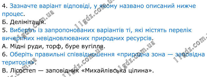 4. Зазначте варіант відповіді, у якому названо описаний нижче процес. Б. Делімітація. 5. Виберіть із запропонованих варіантів ті, які містять перелік вичерпних невідновлюваних природних ресурсів. А. Мідні руди, торф, буре вугілля. 6. Оберіть правильні співвідношення «природна зона — заповідна територія». В. Лісостеп — заповідник «Михайлівська цілина».