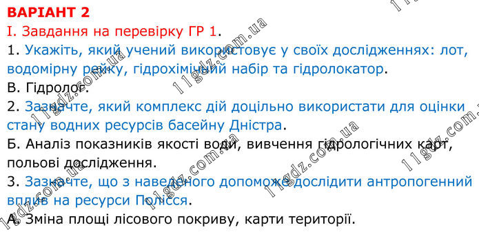 ВАРІАНТ 2 І. Завдання на перевірку ГР 1. 1. Укажіть, який учений використовує у своїх дослідженнях: лот, водомірну рейку, гідрохімічний набір та гідролокатор. В. Гідролог. 2. Зазначте, який комплекс дій доцільно використати для оцінки стану водних ресурсів басейну Дністра. Б. Аналіз показників якості води, вивчення гідрологічних карт, польові дослідження. 3. Зазначте, що з наведеного допоможе дослідити антропогенний вплив на ресурси Полісся. А. Зміна площі лісового покриву, карти території.