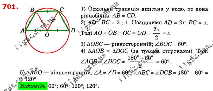 Трапецію вписано в коло так, що діаметр кола є її більшою основою, а відношення основ дорівнює 2 : 1. Знайдіть кути трапеції.