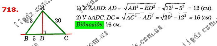 718. З точки до прямої проведено дві похилі завдовжки 13 см і 20 см. Проєкція першої на пряму дорівнює 5 см. Знайдіть проєкцію другої похилої.