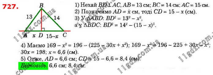 Сторони трикутника дорівнюють 13 см, 14 см і 15 см. Знайдіть проєкції двох менших сторін на більшу сторону.