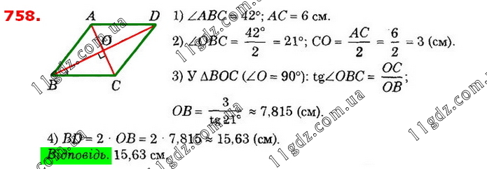 758. Кут ромба дорівнює 42°, а діагональ, що лежить проти нього, - 6 см. Знайдіть другу діагональ ромба (з точністю до сотих сантиметра).