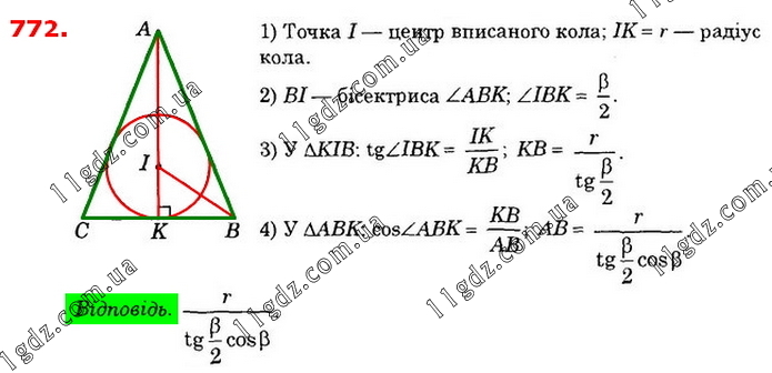 772. Кут при основі рівнобедреного трикутника дорівнює р, а радіус вписаного кола - г. Знайдіть бічну сторону трикутника.