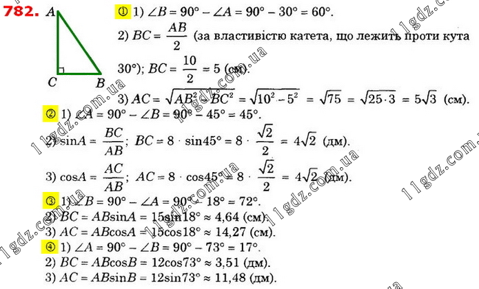 За гіпотенузою АВ прямокутного трикутника АВС і гострим кутом знайдіть інші його сторони та другий гострий кут (сторо ни трикутника в задачах 3) і 4) знайдіть із точністю до сотих).