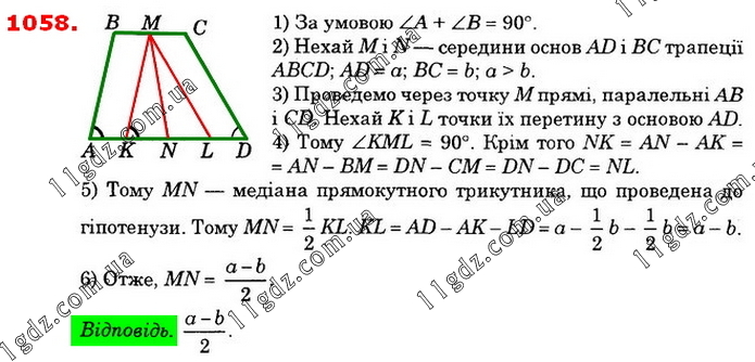Основи трапеції дорівнюють а і Ь (а > Ь), а сума кутів, прилеглих до більшої основи, дорівнює 90°. Знайдіть відстань між серединами основ трапеції