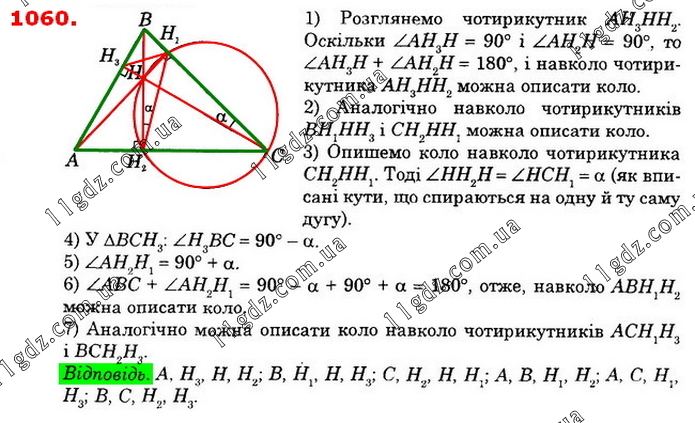 У гострокутному трикутнику АВС проведено висоти АН 1, ВН2 і СН3. Н - точка їхнього перетину. Серед семи точок А, В, С, Н-р Н 2, Н 3 і Н укажіть усі такі їхні четвірки, через які можна провести коло