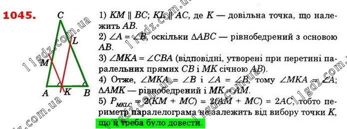 На основі АВ рівнобедреного трикутника АВС взято довільну точку К. Через цю точку паралельно ВС і АС проведено прямі, які перетинають сторони трикутника. Доведіть, що периметр паралелограма, який при цьому утворився, не залежить від положення точки К