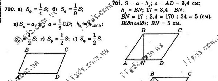 Площа паралелограма ABCD (рис. 219) дорівнює S. Чому до- рівнює площа зафарбованої фігури? 701.° Площа паралелограма дорівнює 17 см2, а одна з його сто- рін — 3,4 см. Знайдіть висоту паралелограма, проведену до цієї сторони.