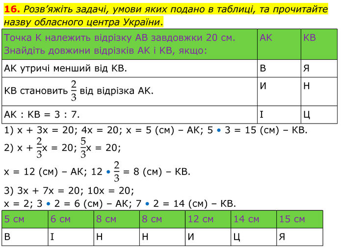 Розв’яжіть задачі, умови яких подано в таблиці, та прочитайте назву обласного центра України. 1) х + 3х = 20; 4х = 20; х = 5 (см) – АК; 5 • 3 = 15 (см) – КВ. 2) х + 2/3х = 20; 5/3х = 20; х = 12 (см) – АК; 12 • 2/3 = 8 (см) – КВ. 3) 3х + 7х = 20; 10х = 20; х = 2; 3 • 2 = 6 (см) – АК; 7 • 2 = 14 (см) – КВ.