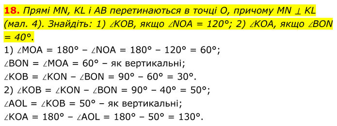 Прямі MN, KL і AB перетинаються в точці О, причому MN ⟂ KL (мал. 4). Знайдіть: 1) ∠KOB, якщо ∠NOA = 120°; 2) ∠KOA, якщо ∠BON = 40°. 1) ∠MOA = 180° – ∠NOA = 180° – 120° = 60°; ∠BON = ∠MOA = 60° – як вертикальні; ∠KOB = ∠KON – ∠BON = 90° – 60° = 30°. 2) ∠KOB = ∠KON – ∠BON = 90° – 40° = 50°; ∠AOL = ∠KOB = 50° – як вертикальні; ∠KOA = 180° – ∠AOL = 180° – 50° = 130°.