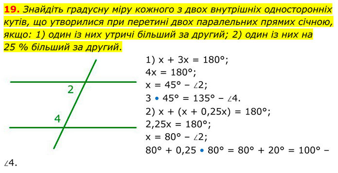 Знайдіть градусну міру кожного з двох внутрішніх односторонніх кутів, що утворилися при перетині двох паралельних прямих січною, якщо: 1) один із них утричі більший за другий; 2) один із них на 25 % більший за другий. 1) х + 3х = 180°; 4х = 180°; х = 45° – ∠2; 3 • 45° = 135° – ∠4. 2) х + (х + 0,25х) = 180°; 2,25х = 180°; х = 80° – ∠2; 80° + 0,25 • 80° = 80° + 20° = 100° – ∠4.