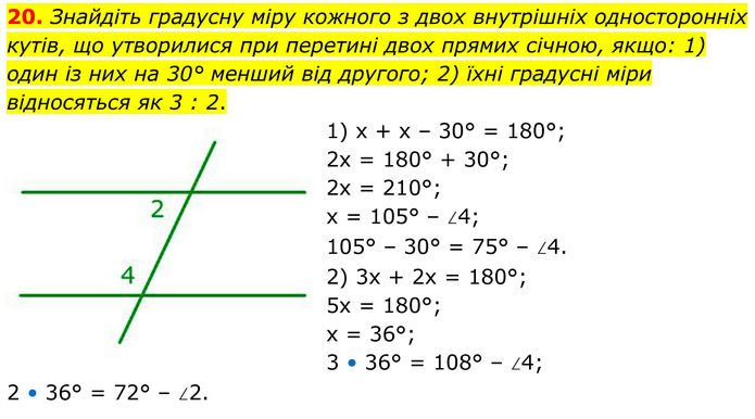 Знайдіть градусну міру кожного з двох внутрішніх односторонніх кутів, що утворилися при перетині двох прямих січною, якщо: 1) один із них на 30° менший від другого; 2) їхні градусні міри відносяться як 3 : 2. 1) х + х – 30° = 180°; 2х = 180° + 30°; 2х = 210°; х = 105° – ∠4; 105° – 30° = 75° – ∠4. 2) 3х + 2х = 180°; 5х = 180°; х = 36°; 3 • 36° = 108° – ∠4; 2 • 36° = 72° – ∠2.