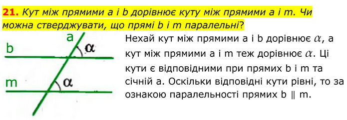 Кут між прямими а і b дорівнює куту між прямими а і m. Чи можна стверджувати, що прямі b і m паралельні? Нехай кут між прямими а і b дорівнює α, а кут між прямими a і m теж дорівнює α. Ці кути є відповідними при прямих b і m та січній a. Оскільки відповідні кути рівні, то за ознакою паралельності прямих b ∥ m.