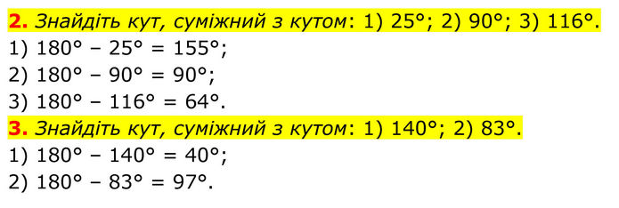 2. Знайдіть кут, суміжний з кутом: 1) 25°; 2) 90°; 3) 116°. 1) 180° – 25° = 155°; 2) 180° – 90° = 90°; 3) 180° – 116° = 64°. 3. Знайдіть кут, суміжний з кутом: 1) 140°; 2) 83°. 1) 180° – 140° = 40°; 2) 180° – 83° = 97°.