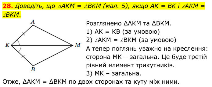 Доведіть, що △AKM = △BKM (мал. 5), якщо AK = BK і ∠AKM = ∠BKM. Розглянемо ΔAKM та ΔBKM. 1) AK = KB (за умовою) 2) ∠AKM = ∠BKM (за умовою) А тепер поглянь уважно на креслення: сторона MK – загальна. Це буде третій рівний елемент трикутників. 3) MK – загальна. Отже, ΔAKM = ΔBKM по двох сторонах та куту між ними.